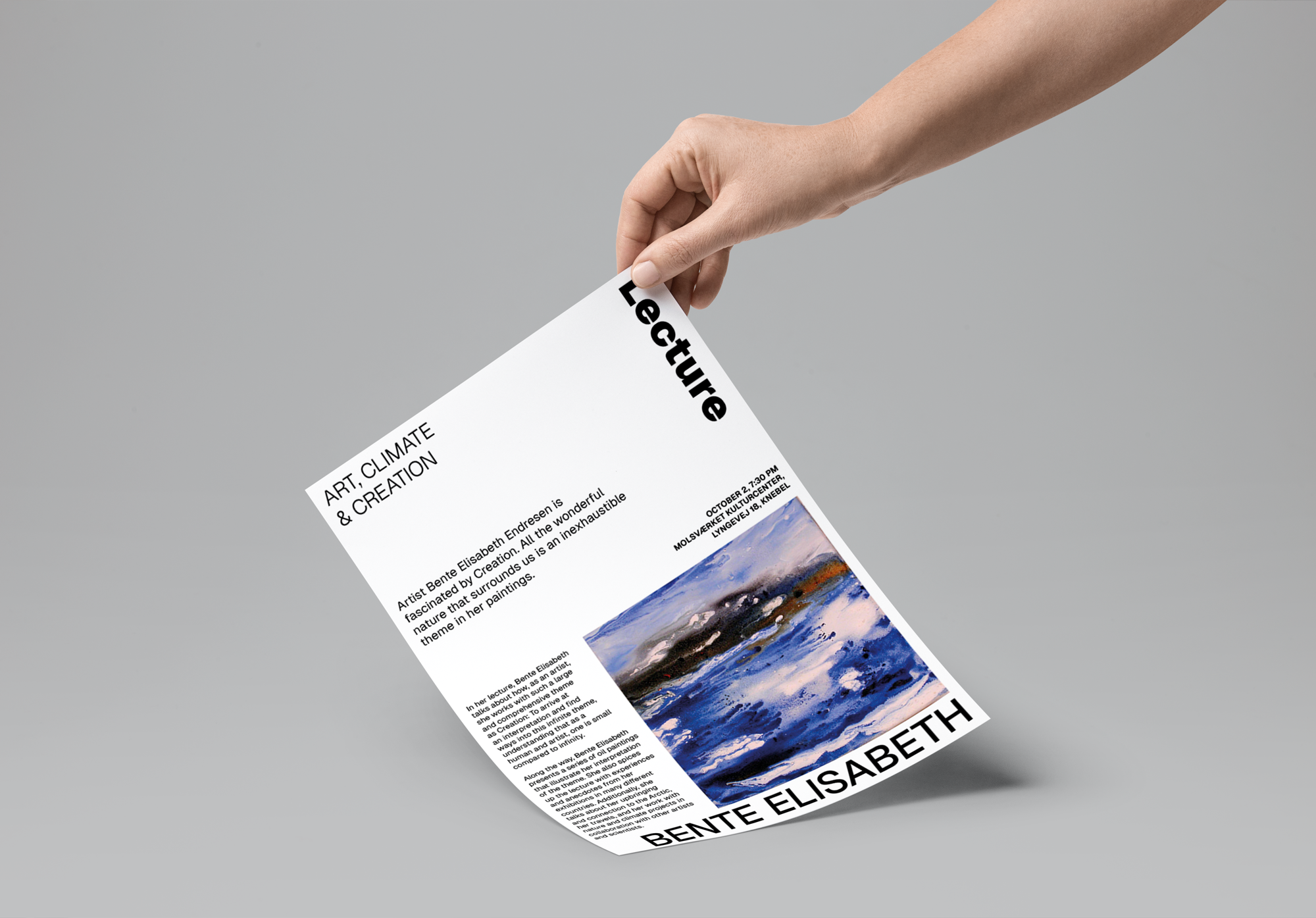 Bente Elisabeth Endresen, an artist with deep roots in Norway and Greenland, now resides in the picturesque Mols Bjerge in Denmark. Her gallery and studio, located with a breathtaking view over Egens and Kalø Vig, reflect her profound connection to nature. From her studio's large windows, she captures the changing landscapes, life, and colors in her paintings. Bente Elisabeth's work balances the abstract and naturalistic, drawing inspiration from the sensory impressions she gathers in nature.